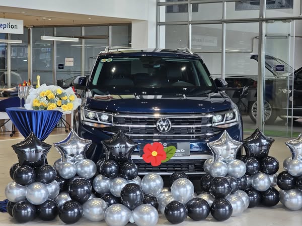 Buổi lễ giao xe Teramont USA được chuẩn bị trang trọng với hoa tươi, champagne và không gian trưng bày đẳng cấp. Chiếc xe nổi bật với màu sơn ngoại thất cuốn hút, kết hợp cùng hệ thống bóng bay và ánh sáng tinh tế, mang đến khoảnh khắc đáng nhớ cho khách hàng trong ngày nhận xe.