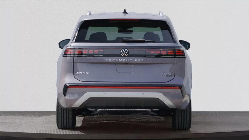 Volkswagen có kế hoạch cung cấp hai phiên bản cản trước cho Teramont Pro: các khe hút gió mỏng hơn cho mẫu xe cơ bản và kiểu dáng thể thao hơn cho các phiên bản cao cấp hơn. Những biến thể này có thể ám chỉ đến các phiên bản tiêu chuẩn và R Line. Ở phía sau, đèn hậu được nhúng trong một mảnh trang trí tối màu, kéo dài vào trong hồ sơ—tương tự như Tiguan nhỏ hơn. Phần thân xe khá sạch sẽ và phẳng phiu, phần nào gợi nhớ tới các mẫu xe Volvo.