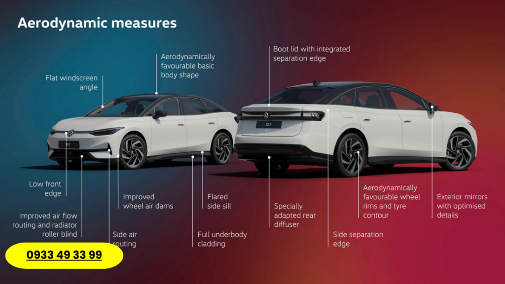 • ID.7 Pro: Thiết kế tiêu chuẩn với mâm xe hợp kim 19 inch, hệ số cản gió 0,23 (tối ưu khí động học).