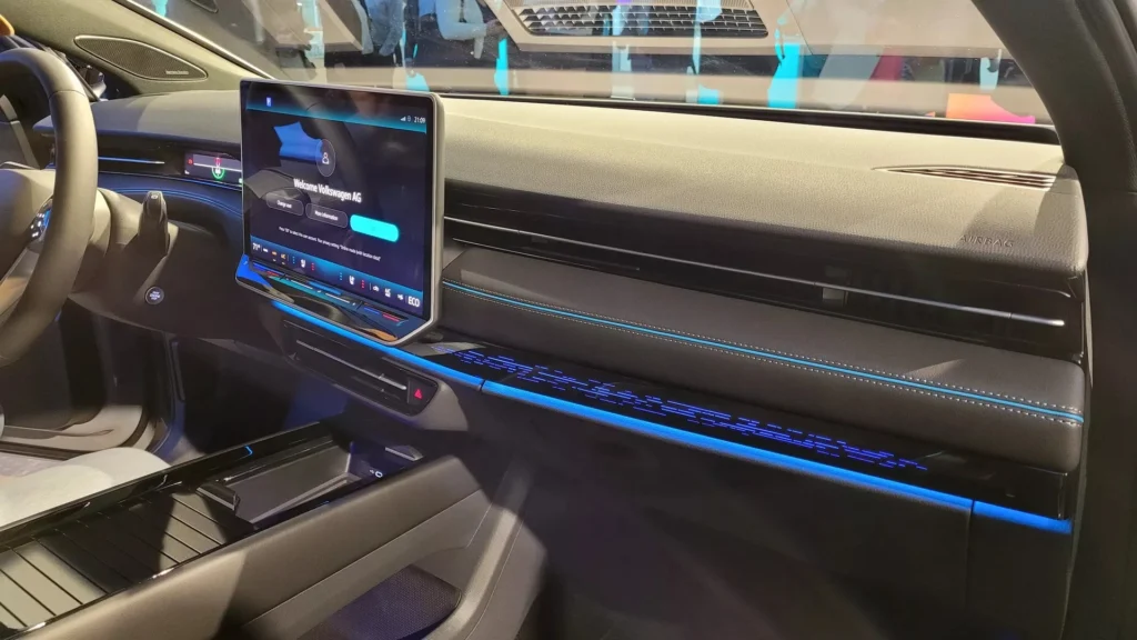 Với kích thước lớn nên Volkswagen ID.7 sở hữu không gian nội thất 5 chỗ ngồi khá rộng rãi. Theo đúng xu hướng hiện nay, mẫu ô tô điện này cũng có vô lăng vát đáy thể thao và màn hình cảm ứng trung tâm cỡ lớn, lên đến 15 inch, đặt nổi trên mặt táp-lô.