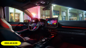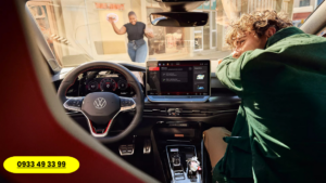 - Không gian thể thao, cao cấp: Nội thất Golf GTI 2025 kết hợp phong cách thể thao và tiện nghi với ghế vải caro Scalepaper Plaid hoặc ArtVelours (tùy phiên bản), vô-lăng D-cut bọc da tích hợp lẫy chuyển số, và bàn đạp kim loại. Hệ thống đèn nội thất 30 màu tùy chỉnh tạo cảm giác hiện đại.