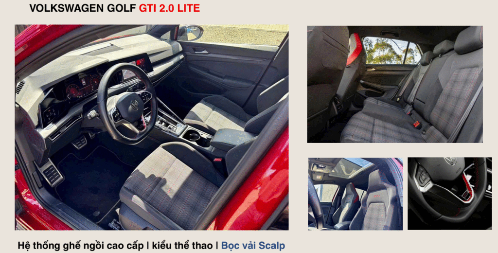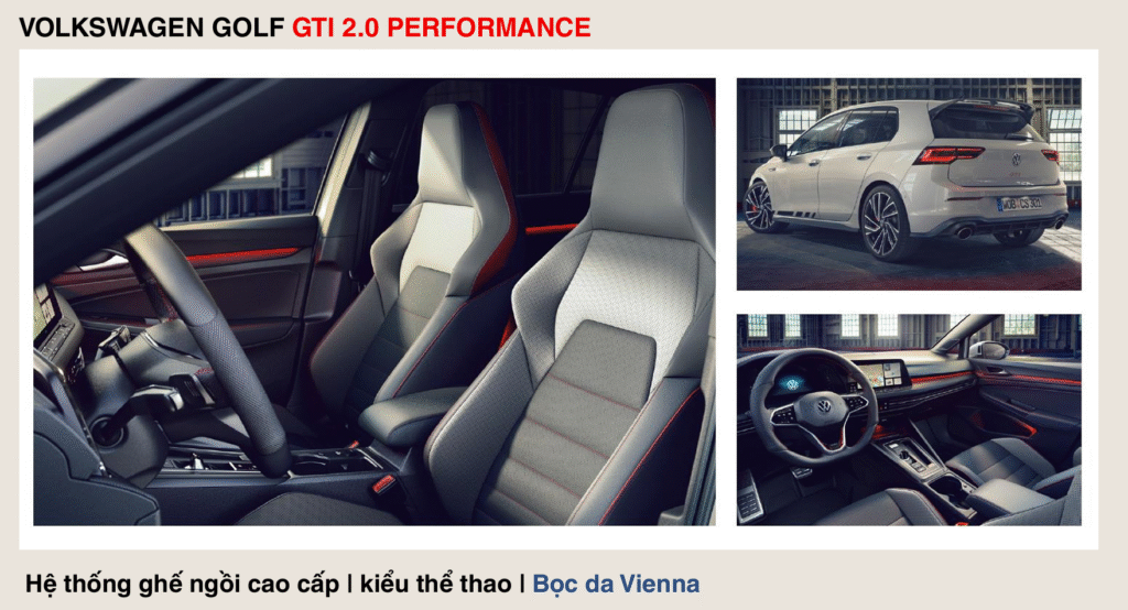 | Nội thất & Vật liệu ghế | Ghế thể thao bọc vải Scalp, logo GTI, chỉ đỏ | Ghế thể thao bọc da Vienna cao cấp, logo GTI, chỉ đỏ |