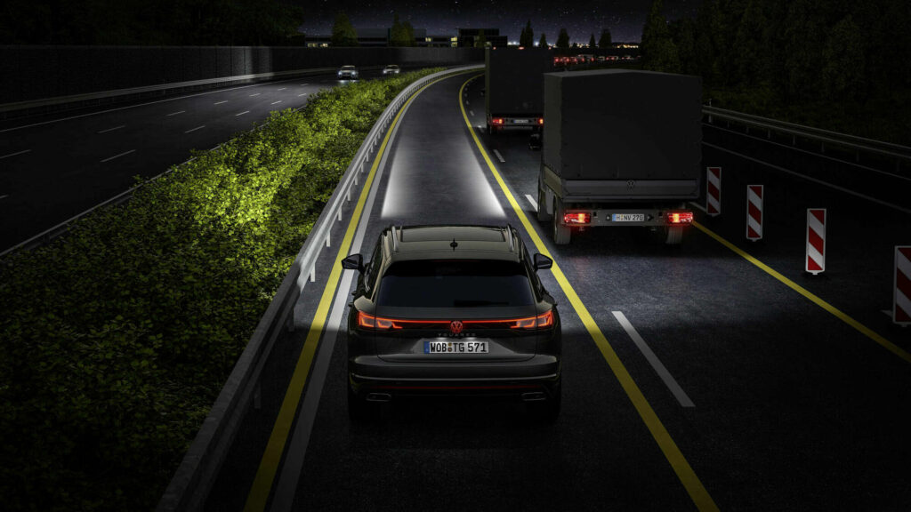 Chi tiết công nghệ cao. Ba mô-đun trong mỗi đèn pha đều thực hiện các nhiệm vụ riêng của chúng. Một mô-đun ma trận kép nằm ở bên ngoài với 16 điểm ảnh LED cho đèn chiếu sáng xung quanh và đèn pha bổ sung. Mô-đun ma trận HD thực tế nằm ở giữa với 19.200 đèn LED có thể điều khiển riêng lẻ cho phép thực hiện nhiều chức năng chiếu sáng mới. Nằm bên trong là một gương phản xạ cho các chức năng chiếu sáng khi vào cua tĩnh và động và đèn chiếu sáng trong thời tiết xấu. Cả ba mô-đun đều tạo ra một điểm sáng; cùng với ba thành phần LED hình chữ L cho đèn chạy ban ngày và dải đèn LED nằm ngang trong lưới tản nhiệt kéo dài đến dưới đèn pha, điều này tạo nên một thiết kế ánh sáng độc đáo. Ngoài ra, đặc biệt khi kết hợp với hệ thống hỗ trợ Tầm nhìn ban đêm – phát hiện người và động vật bằng camera ảnh nhiệt và hiển thị chúng trên các cụm đồng hồ kỹ thuật số (Buồng lái kỹ thuật số) và các tín hiệu cảnh báo tương ứng trên màn hình hiển thị trên kính chắn gió tùy chọn – hệ thống chiếu sáng ma trận HD của Touareg 2026 là một trong những hệ thống chiếu sáng và tầm nhìn ban đêm tốt nhất trên thế giới. Hệ thống Tầm nhìn Ban đêm cũng bao gồm đèn báo hiệu, chiếu sáng tạm thời những người ở khu vực nguy hiểm tiềm ẩn bằng ánh sáng đặc biệt mạnh, giúp tài xế dễ dàng quan sát hơn. Sự kết hợp giữa đèn pha ma trận IQ.Light HD và Tầm nhìn Ban đêm có thể giúp nhận diện sớm hơn và giảm thiểu các tình huống nguy hiểm.