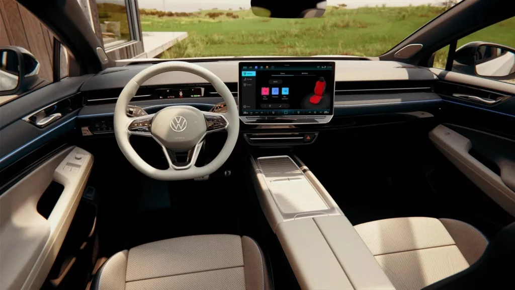 Nội thất Volkswagen ID7 được thiết kế khá gọn gàng. Xe có màn hình giải trí 15 inch cùng một màn hình cỡ nhỏ ở phía trước vô lăng. Tất cả mọi chức năng trên xe đều được hiển thị trên màn hình 15 inch, nhờ đó mà số lượng phím bấm vật lý được cắt giảm tối đa.