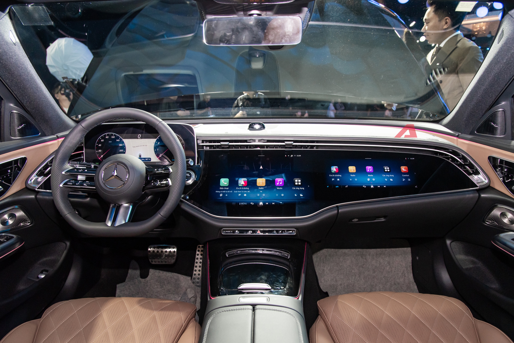 Ở bên trong, bản E 300 có màn hình MBUX Superscreen gồm màn hình cảm ứng 14,4 inch trung tâm, một màn hình cho ghế phụ 12,3 inch và màn hình 12,3 inch sau vô-lăng. Các bản thấp hơn có 2 màn hình (không có màn bên ghế phụ). Xe có hỗ trợ Apple CarPlay/Android Auto không dây. Phiên bản E 300 trang bị 17 loa Burmester 4D công suất 710W. Ghế chỉnh điện, nhớ vị trí, tích hợp làm mát và thông gió. Kính cách âm, cách nhiệt. Điều hòa trên E 300 là 4 vùng, trong khi E 200 là 2 vùng.